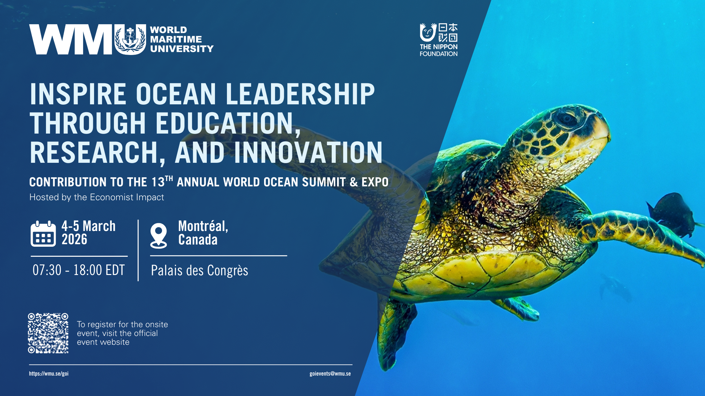 The World Maritime University (WMU)Sasakawa Global Ocean Institute (GOI) will participate in the 13th annual World Ocean Summit, organized by the Economist Impact, taking place onsite at the Palais des Congrès in Montréal, Canada, on 4–5 March 2026. WMU-GOI will serve as an official supporter of the Summit, hosting an exhibition booth at the Summit Expo and contributing to the programme as panelists.